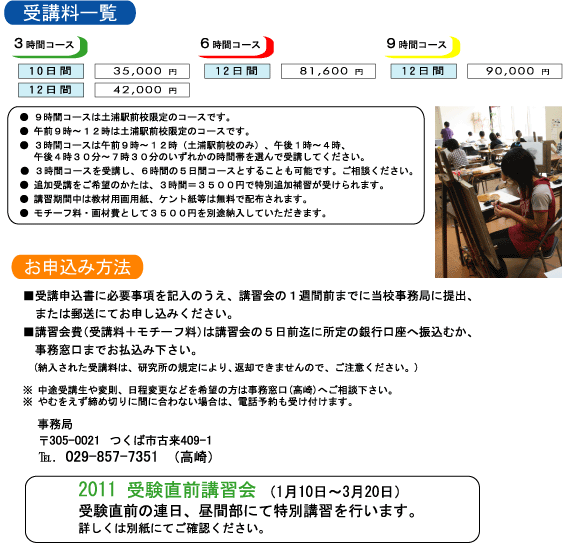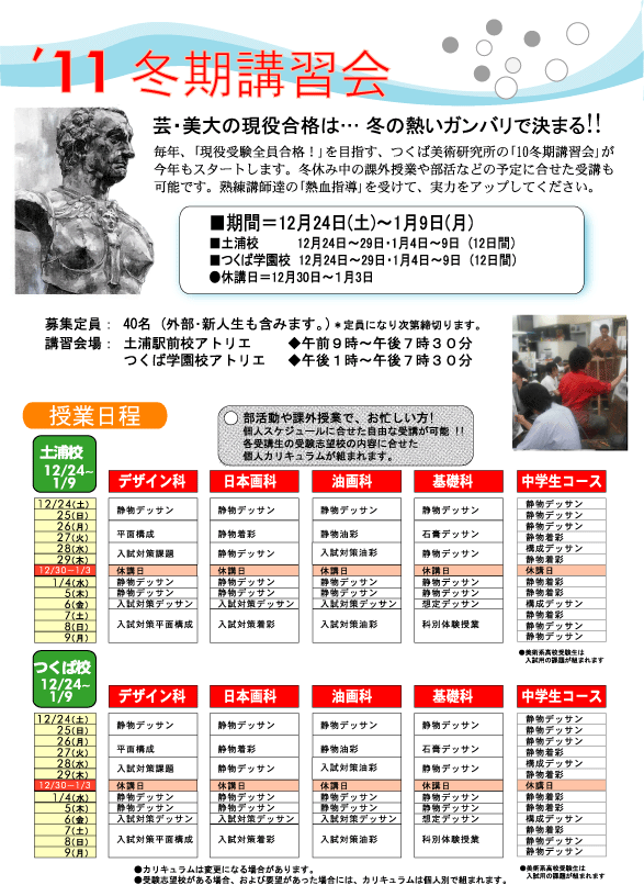 毎年、「現役受験全員合格!」を目指す、つくば美術研究所の「11冬期講習会」が今年もスタートします。 冬休み中の課外授業や部活などの予定に合せた受講も可能です。 熟練講師達の「熱血指導」を受けて、実力をアップしてください。